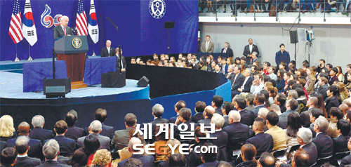 | 美 부통령 국내서 첫 정책 연설 조지프 바이든 미국 부통령(연단 위)이 6일 연세대 신촌캠퍼스 체육관에서 학생과 교직원 등 1300여명이 참석한 가운데 한·미 동맹의 중요성과 미국의 아태지역에 대한 지속적인 관심을 강조하는 내용의 정책 연설을 하고 있다. 미국 부통령이 우리나라에서 정책 연설을 한 것은 바이든 부통령이 처음이다. 김범준 기자 |