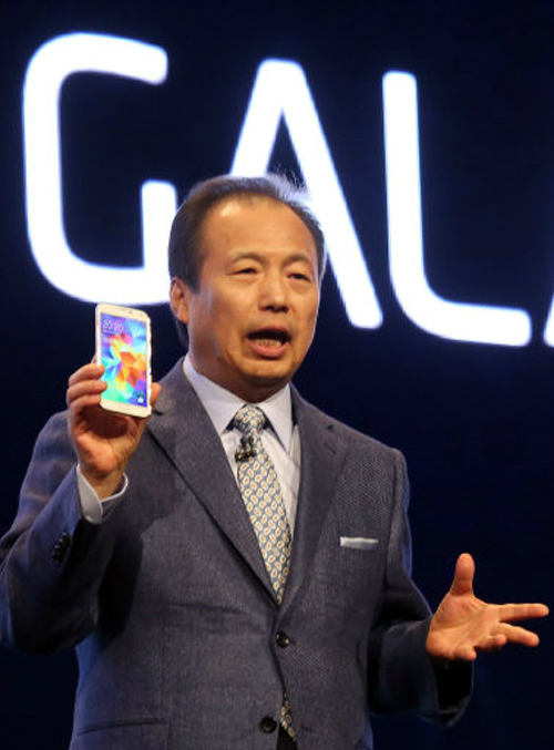 | 삼성전자 IM부문 신종균 대표가 24일(현지시간) 스페인 바르셀로나에서 열린 언팩 행사에서 갤럭시 S5를 선보이고 있다. 삼성전자 제공 |