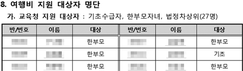 | 서울 강북구 A중학교의 수학여행 심의 결과. 여행비 지원대상 학생의 반·번호·이름·지원 사유가 고스란히 노출돼 있다.(해당 부분은 모자이크 처리) |