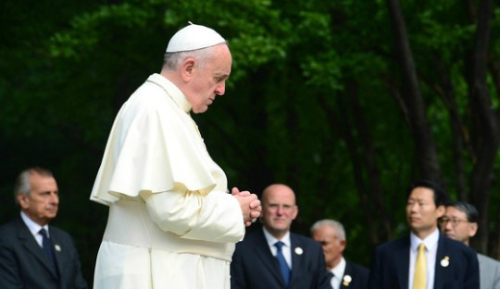 프란치스코 교황이 서울 서소문 순교성지를 방문해 약 3분간 묵념했다. 항상 온화한 미소를 지었던 교황의 얼굴도 이 순간만은 슬픔에 싸였다.