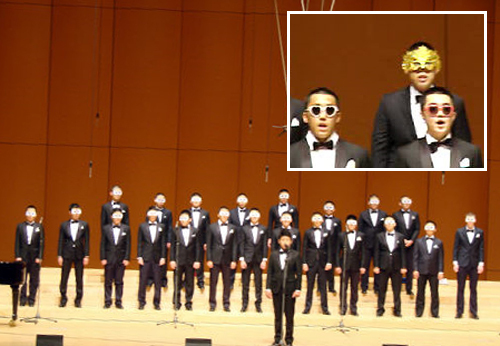 | 경기도 의왕시 고봉중고등학교 합창단 학생들이 7일 서울 여의도 KBS홀에서 서울아버지합창단이 연 자선음악회 ‘가을밤, 사랑은 선율을 타고’에서 열창하고 있다. 법원에서 보호처분을 받은 학생들은 이날 눈을 가린 가면을 쓰고 등장했다. 서울아버지합창단 제공 |