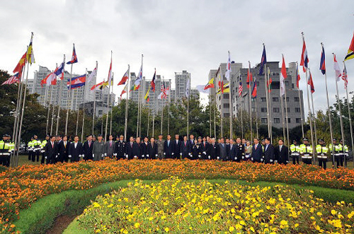 부산시가 지난달 22일 부산시청 아세안 국기공원에서 한·아세안 특별정상회의 참가국 국기 게양식을 거행하고 있다.