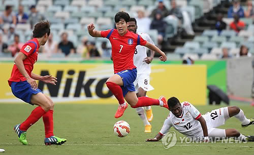 10일 호주 캔버라 스타디움에서 열린 2015 AFC 호주 아시안컵 조별리그 A조 1차전 한국 대 오만 경기. 손흥민이 상대 수비를 제치고 돌파를 하고 있다.