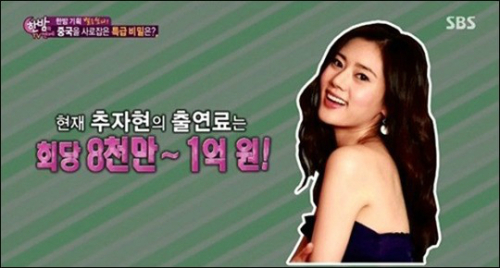 또 추자현은 회당 1억원 출연료 질문에 “현재 출연료는 10배 차이가 난다. 그런데 그게 맨 처음과 비교하면 10배도 더 차이가 나는데, ‘귀가의 유혹’(한국 드라마 ‘아내의 유혹’ 리메이크 작품) 출연했을 때와 비교해서 딱 10배 차이 난다”고 밝혔다.
