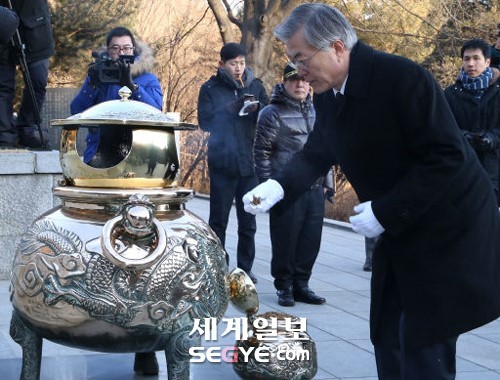 | 박정희 묘소 참배 새정치민주연합 문재인 신임 대표가 9일 취임 후 첫 일정으로 서울국립현충원을 찾아 박정희 전 대통령 묘소를 참배하고 있다. 앞서 문 대표는 김대중·이승만 전 대통령 묘소도 참배했다. 야당 대표가 보수 진영의 두 전직 대통령 묘소를 참배한 것은 이번이 처음이다. 남정탁 기자 |