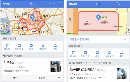 주소를 검색할 때에도 해당 주소지에 위치 범위와 해당 주소지에 위치한 업체들의 정보를 확인할 수 있는 등 보다 편리하게 지역 정보를 활용할 수 있다.
