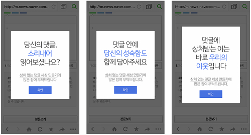 이번에 팝업될 캠페인 문구는 '댓글에 당신의 성숙함도 함께 보여주세요', '당신의 댓글, 소리내어 읽어보셨나요?', '댓글 안에 당신의 성숙함도 함께 담아주세요', '댓글에 상처받는 이는 바로 우리의 이웃입니다', '말이 입힌 상처는 칼이 입힌 상처보다 깊다(모로코 속담)', '남의 결점을 지적하더라도 결코 듣기 싫은 말로 하지 말고 사랑으로써 할 것이외다(도산 안창호)' 등 5개 문구가 랜덤으로 노출될 예정이다.