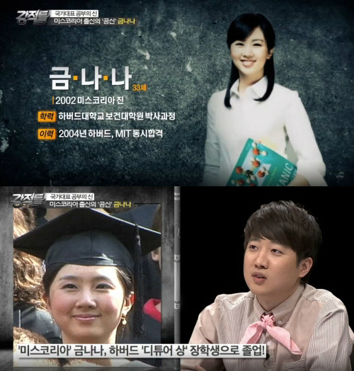 지난 6월 방송된 TV조선 <강적들>에서는 ‘국가대표 공부의 신’ 특집이 진행된 가운데 2002년 미스코리아 진 금나나가 선정됐다.