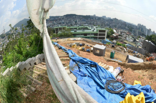 | 70년 넘게 서울 서대문구 연희동 주민들의 쉼터로 이용됐던 ‘궁동산개나리언덕’이 최근 고급빌라를 짓기 위한 개발행위(형질변경)로 인해 벌건 흙이 그대로 모습을 드러내 공사장 밖 공원과 대조를 이루고 있다. 이재문 기자 |