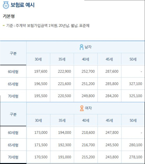두 상품 모두 주계약 가입금액 1억원, 의료비지급형, 20년납, 월납, 표준체 조건으로 60세형은 남성 30세 19만7600원, 35세 22만2900원, 40세25만2700원이었으며, 여성은 30세17만3000원, 35세 19만4000원, 40세 21만8600원, 45세 24만7800원이었다.