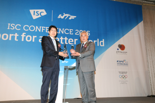 | 국제스포츠협력센터(ISC) 이은철 이사장(왼쪽)이 26일 서울 중구의 더 플라자 호텔 그랜드볼룸에서 ‘스포츠, 더 나은 세상을 꿈꾸다’라는 주제로 공동 주최한 국제 컨퍼런스에서, 조정원 세계태권도연맹 총재에게 감사패를 전달한 후 기념 사진을 찍고 있다. <사진제공: 세계태권도연맹> |