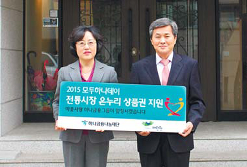 하나금융나눔재단은 21개 비영리 민간단체에 전통시장 상품권 2억1000만원어치를 지난 17일 전달했다. 이 상품권은 노숙자·독거노인·이주노동자 등을 위한 무료급식소의 식재료 구입, 미혼모·중증장애인 등을 위한 생활필수품 구입, 북한이탈 학생·이주여성 등의 전통시장 물건 구입 체험 활동 등에 사용될 예정이다.