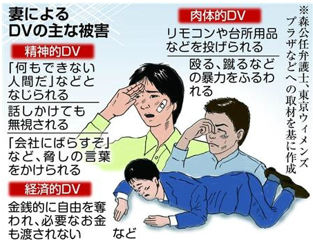| 아내에게 시달리는 남성의 사례. 육체적, 정신적, 금전적인 고통에 시달리고 있다. (산케이신문 1월 26일 “아내의 폭력이 무서워”, 증가하는 남성DV(가정폭력) |