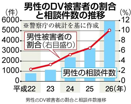이런 가정폭력 피해상담은 해마다 증가에 일본 경찰청이 2014년 집계한 통계에 따르면 2012년 약 800건이던 가정폭력이 2년새 7.5배 증가해 6000건이 됐다. 보고된 사례 외 밝혀지지 않은 수를 더하면 피해는 더 클 것으로 보인다. 피해 남성들의 상담을 담당하는 변호사는 “직장이나 친인척, 지인에게 알려지는 것을 두려워하며, 성별에 따른 고정 관념이 강해 남성이 피해를 호소해도 ‘그럴 리 없다‘고 무시하는 경우가 많다”고 말한다. 상황이 이렇다 보니 가정폭력 피해자 여성을 돕는 ‘도쿄 여성 프라자’가 발 벗고 나서 남성전용 상담 창구를 개설(2013년)하는 상황이 됐다.