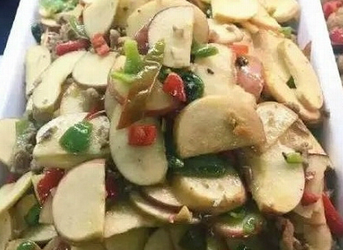 | 사과 고기볶음. 사과를 크게 썰어 넣은 것이 특징이다. |