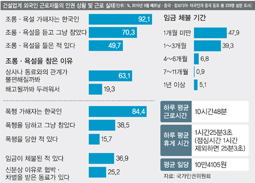 응호씨 사례는 일이 고되 내국인들이 기피하는 건설 현장에서 일하는 외국인 이주 노동자들의 상황을 보여주는 축소판이다. 20일 국가인권위원회의 ‘2015년 건설업 종사 외국인 근로자 인권 상황 실태조사’ 연구용역 보고서에 따르면 건설업계의 외국인 근로자들은 공공연한 인권 침해와 차별에 시달리고 있다. 일용직이나 미등록 취업자가 많아 정확한 현황을 파악하기 힘든 건설업계의 외국인 근로자와 중국 동포의 인권 상황 실태를 직접 조사한 것은 이번이 처음이다.