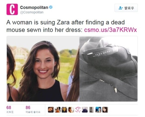 | 패션지 코스모폴리탄이 공개한 케일리 피셀(왼쪽)과 죽은 쥐가 들어있는 자라의 여성 드레스. 코스모폴리탄 트위터 캡처. |