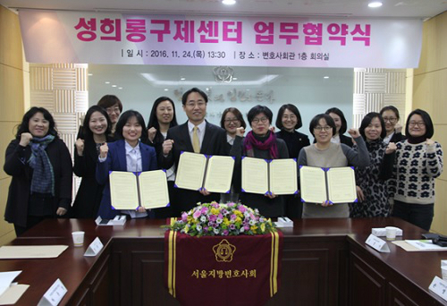 | 서울지방변호사회·서울여성노동자회·여성노동법률지원센터 등 관계자들이 성희롱구제센터 운영에 관한 업무협약 체결 후 기념촬영을 하고 있다. 서울지방변호사회 제공 |