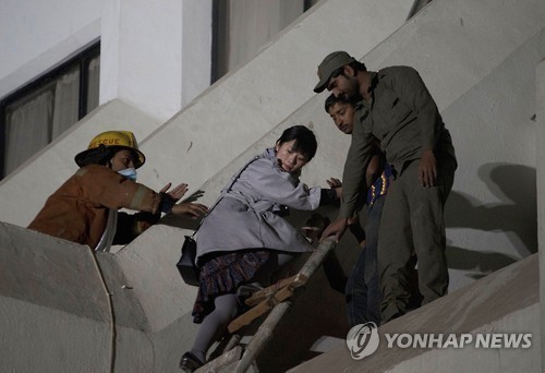 | 5일 파키스탄 리젠트 플라자 호텔에서 불이 나 소방대원 등이 외국인 관광객을 대피시키고 있다. |
