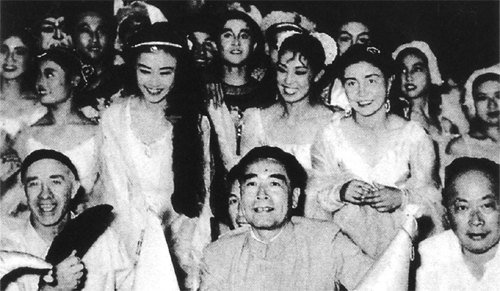 | 1952년 최승희 공연을 관람하고 있는 저우언라이 중국 총리(앞줄 가운데). 저우언라이는 최승희가 숙청된 뒤인 1960년에도 최승희의 무대를 북한 측에 비밀리에 부탁했을 정도로 열렬한 팬이었다. |