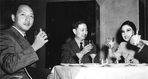 | 최승희(오른쪽)와 중국 경극의 명배우인 메이란팡(가운데). 두 사람은 1943년과 1945년에 중국에서 만났다. 촬영 장소와 연도는 미상. |