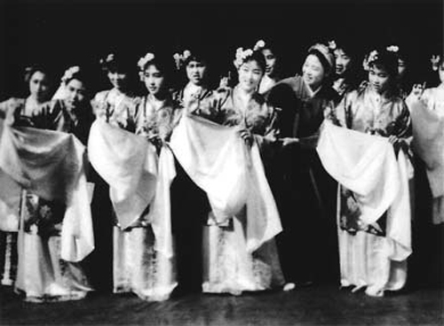 | 1951년 중국 베이징 중앙희극학원 최승희 무도연구반 학생들. 최승희는 1951년 3월 중국중앙희극원 안에 ‘최승희무도연구반’을 개설했다. |