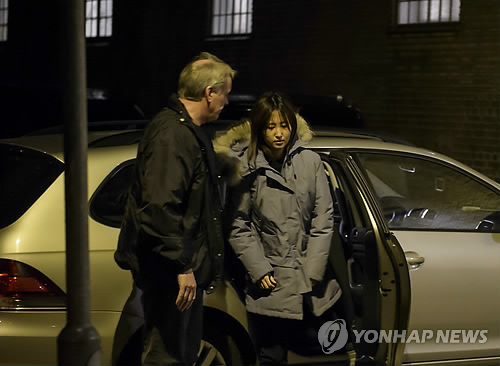 | 덴마크 올보르시 경찰에 불법체류 혐의로 체포된 정유라 씨(오른쪽)가 2일(현지시간) 올보르 법원에서 예비심리를 마친 뒤 다시 구금되고 있다. |