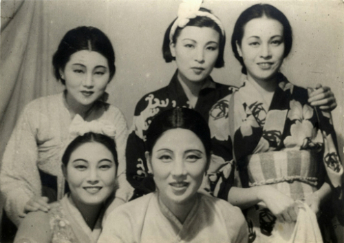 1943년 10월 극장 분장실에 함께 모인 최승희와 제자들. 뒷줄 왼쪽 시계방향부터 이석예, 장추화, 하리타 요코, 최승희, 김백봉.