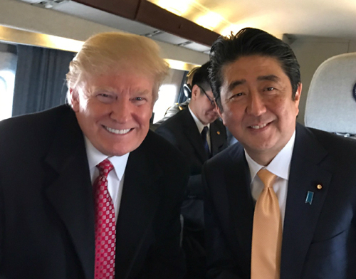 | 도널드 트럼프 미국 대통령(왼쪽)이 지난 10일(현지시간) 미국을 방문한 아베 신조 일본 총리와 전용기 에어포스원을 타러 가는 차량에 나란히 앉아 웃고 있다. 트럼프 트위터 캡쳐 |