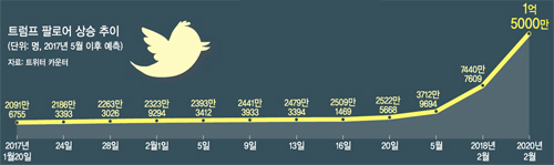 현재 트럼프 대통령의 트위터 계정 팔로어는 2500만여명에 육박한다. 취임 직후인 지난달 20일 2091만6755명이었던 팔로어는 한달 사이 약 400만명이 증가하는 등 날이 갈수록 관심이 쏠리고 있다. 트위터 관련 통계·분석 사이트인 ‘트위터 카운터’(twittercounter)에 따르면 트럼프는 전체 트위터 사용자 팔로어 순위에서 세계 47위에 랭크돼 있다. 특히 취임 이후 팔로어 증가 추세가 뚜렷한 것으로 나타났다. 3개월 후에 트럼프의 트위터 팔로어는 3500만명을 넘을 것으로 예측되며, 1년 후에는 7500만명, 3년 후에는 1억5000만명에 달할 것이라고 트위터 카운터는 예측했다.