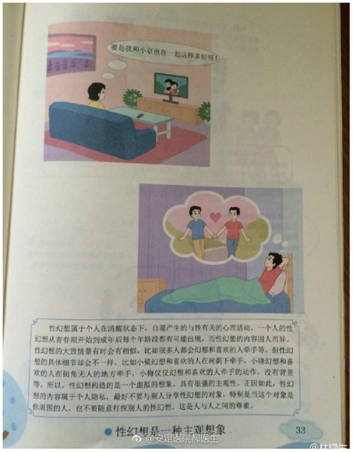 | 중국 베이징사범대 출판부가 최근 배포한 초등학교 4학년 성교육 교재의 일부 단원. 이 단원은 동성애를 삽화로 다루고 있다. 중국 상하이스트 캡처 |