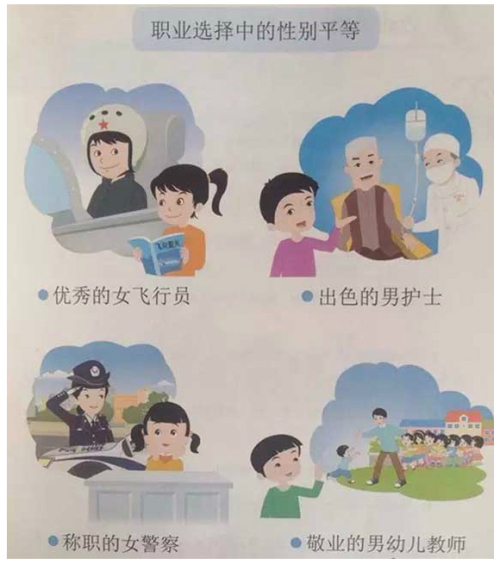 | 중국 베이징사범대 출판부가 최근 배포한 초등학교 2학년 성교육 교재의 일부 단원. 이 단원은 삽화를 통해 여학생도 경찰이나 우주비행사가 될 수 있고, 남학생 역시 간호사나 유치원 교사가 될 수도 있다고 가르친다. 중국 상하이스트 캡처 |
