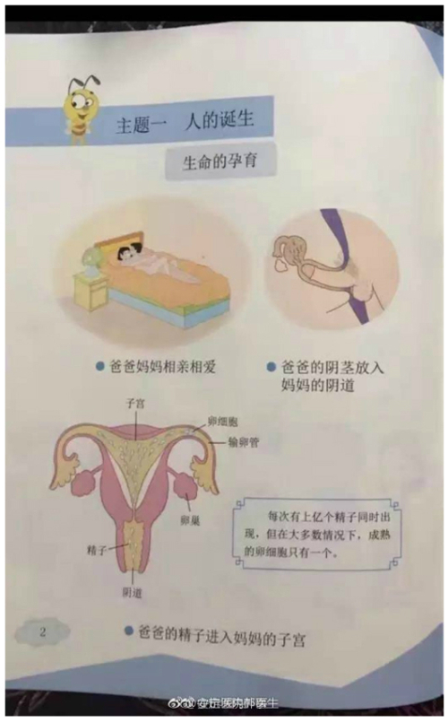 | 중국 베이징사범대 출판부가 최근 배포한 초등학교 2학년 성교육 교재의 일부 단원. 이 단원은 삽화로 남녀의 성관계와 성기 구조 등을 알려준다. 중국 상하이스트 캡처 |
