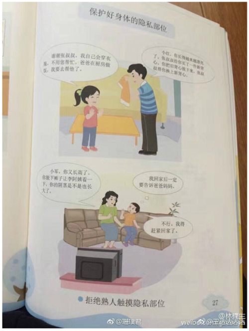 | 중국 베이징사범대 출판부가 최근 배포한 초등학교 2학년 성교육 교재의 일부 단원. 이 단원은 성범죄 가해자는 남녀 모두 될 수 있다고 가르친다. 그 예로 옷을 갈아입는 걸 도와주겠다는 삼촌과 성기가 얼마나 컸는지 보자며 바지를 내려보라는 이모를 삽화에 담았다. 중국 상하이스트 캡처 |