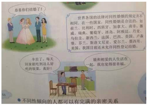 | 중국 베이징사범대 출판부가 최근 배포한 초등학교 고학년용 성교육 교재의 일부 단원. 이 단원은 동성 간 교제와 결혼 등을 삽화로 다룬다. 중국 상하이스트 캡처 |