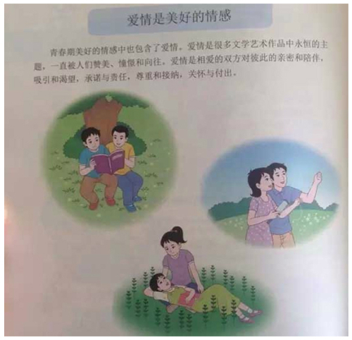 | 중국 베이징사범대 출판부가 최근 배포한 초등학교 4·5학년 성교육 교재의 일부 단원. 이 단원은 나무 아래 함께 누운 남학생, 잔디밭에서 무릎 베개를 한 여학생 커플을 삽화로 그려넣었다. 중국 상하이스트 캡처. |