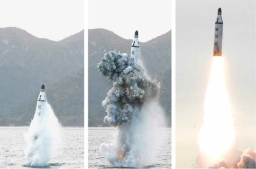 | 북한 매체가 2016년 4월 24일 보도한 4월 23일의 SLBM 발사 모습. |