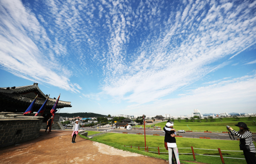 | 선선한 가을 날씨를 보인 29일 오전 경기도 수원시 팔달구 수원화성(華城) 창룡문 주변을 관광객들이 사진 찍고 있다. |