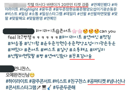| 사회관계망서비스(SNS)에 무료표 인증한 관객들. 출처=온라인커뮤니티 |