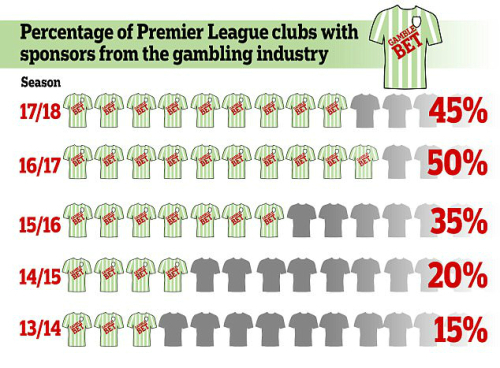현재 17-18시즌 EPL을 후원하는 도박사이트들의 유니폼 후원금은 5000만 파운드(한화 739억)에 달한다.