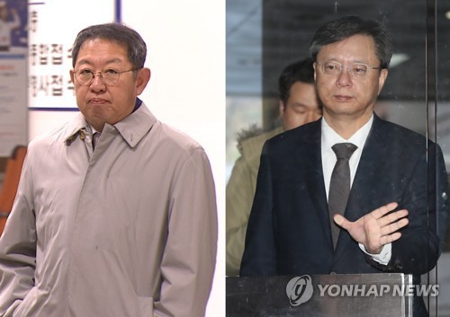 이석수 전 특별감찰관(왼쪽)과 우병우 전 청와대 민정수석(오른쪽)이 27일 오전 서초구 서울중앙지방법원에서 열린 우 전 수석의 속행 공판에 증인으로 출석하기 위해 이날 오전 각각 법정으로 향하고 있다. 연합뉴스