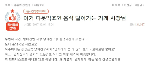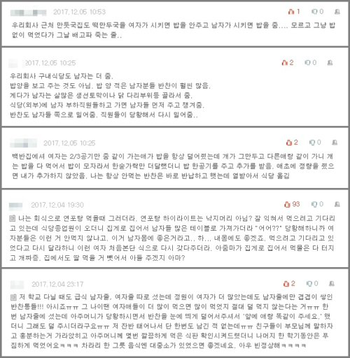 또 다른 네티즌은 자신이 겪은 일화를 전했다. 남녀 밥양이 다르게 나왔다고. 이에 대해 항의하니 종업원은 "여자들은 양이 적어서"라고 설명했다.