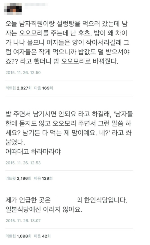 이에 네티즌이 "그럼 여자들은 적게 먹으니까 밥값도 덜 받으셔야죠?"라고 물었고, 종업원은 밥을 남자직원과 비슷한 양으로 바꿔줬다.