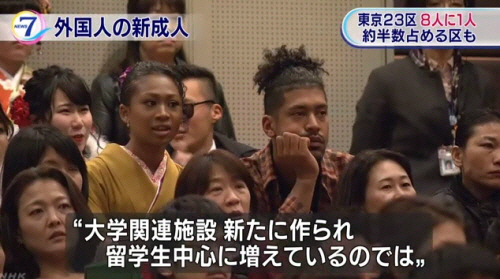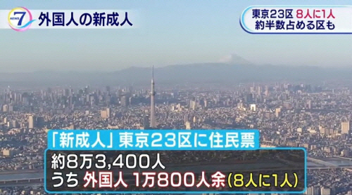 이러한 가운데 일본 도쿄 23구에서는 외국인의 유입 증가로 성인 편입인구 8명 중 1명이 외국인인 것으로 나타났다. 올해 성인이 된 도쿄 거주 청년은 약 8만3000명으로 집계됐다.
