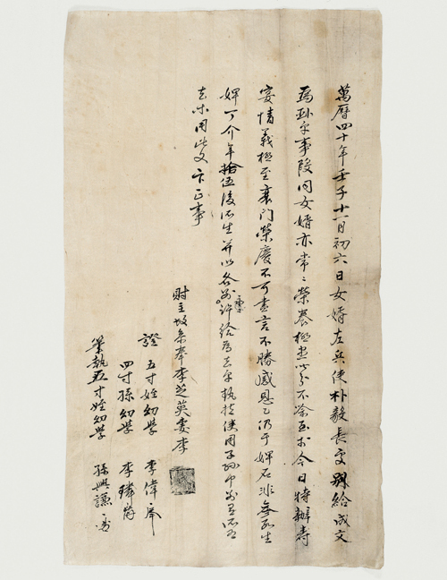 | 1603년 박의장이 양부에게 재산을 물려받은 뒤 관청에서 발급받은 문서인 ‘영해부 입안’. |