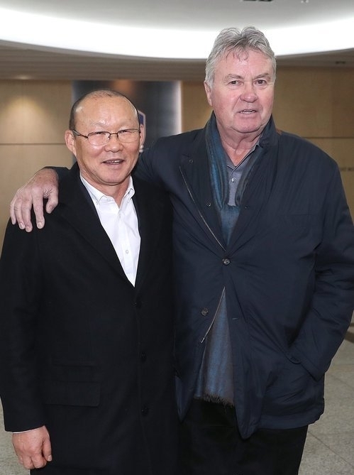 박항서 베트남 축구대표팀 감독과(왼쪽) 거스 히딩크 전 한국 대표팀 감독이 지난달 13일 오후 서울 종로구 신문로 축구회관에서 만나 어깨동무하고 있다. 둘은 2002년 한·일 월드컵 당시 각각 국가대표팀의 수석 코치와 감독으로 인연을 맺은 바 있다. 연합뉴스