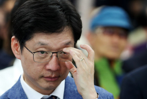 | 더불어민주당 김경수 의원이 25일 오후 부산 부산진구 서면 오거돈 부산시장 예비후보 선거캠프에서 열린 개소식에서 안경을 고쳐 쓰고 있다. 연합뉴스 |