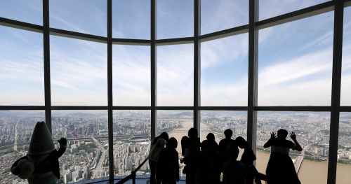 | 미세먼지농도가 `좋음` 단계를 보인 21일 오후 서울 강남구 롯데월드타워 서울스카이 전망대에서 바라본 서울도심속 하늘이 파란색 물감을 풀어놓은 듯 맑고 쾌청한 날씨를 보이고 있다. |
