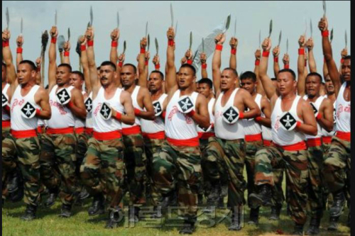| 세계 3대 용병부대 중 하나인 네팔 구르카족 병사들이 전통 단검인 쿠크리와 손바닥만한 방패를 들고 집단 무예를 선 보이고 있다. 영국군 용병의 주축인 이들은 싱가포르 경찰 인력의 15%가량을 구성하고 있으며 오는 12일 싱가포르 북미정상회담 경호 최선봉에 선다. |