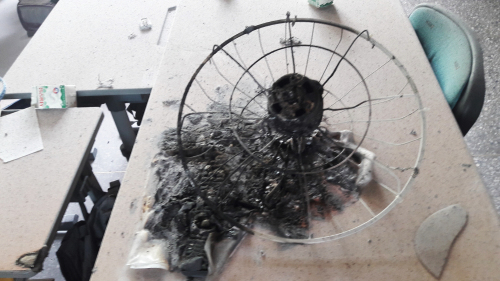 | 지난 5월 15일 오후 12시 16분께 구미시의 한 중학교 1학년 교실에서 발생한 화재로 선풍기가 불에 탔다. 구미소방서 제공 |